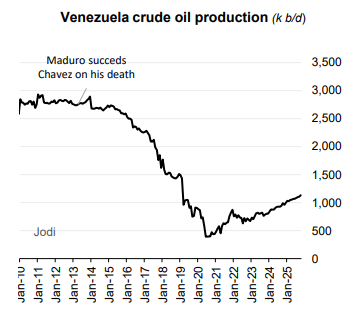 Trong trung hạn (tối đa 2 năm tới), sản lượng dầu thô của Venezuela được dự báo có thể duy trì ổn định trên mức 1 triệu thùng/ngày, tương đương với giai đoạn nửa đầu năm 2025. Biểu đồ sản lượng trong 12–18 tháng qua cho thấy mức khai thác đã sụt giảm còn 1/3 so với thời kỳ tiền nhiệm. Tuy nhiên, chúng tôi sẽ điều chỉnh lại quan điểm này, cân nhắc đến khả năng quá trình phục hồi sẽ bị chậm lại do hạ tầng kỹ thuật, bao gồm: