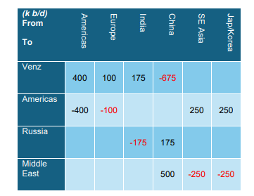 Việc chuyển hướng dầu thô Nga đã khiến khu vực Đại Tây Dương thiếu hụt nguồn dầu chua. Vì vậy, trong mô hình dự báo, chúng tôi ước tính 3/4 sản lượng dầu thô xuất khẩu của Venezuela vẫn sẽ tiếp tục ở lại khu vực Đại Tây Dương để bù đắp phần thiếu hụt này.