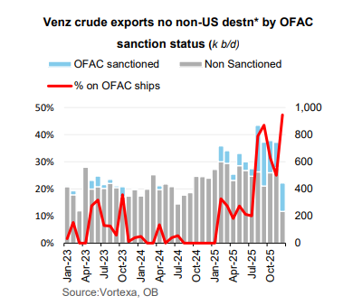 Xuất khẩu dầu thô của Venezuela đến các điểm đến ngoài phạm vi Hoa Kỳ hiện đang chịu ảnh hưởng lớn bởi đội tàu nằm trong danh sách trừng phạt OFAC, chiếm tỷ trọng áp đảo trong tổng khối lượng vận chuyển bằng tàu dầu.